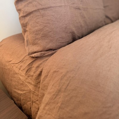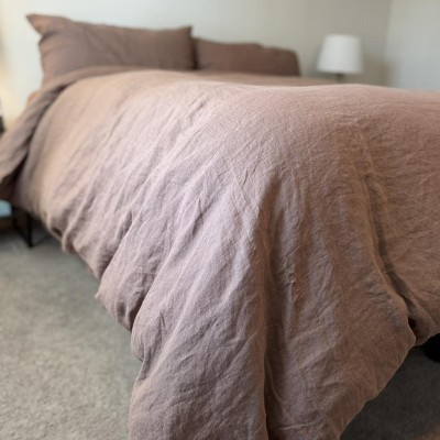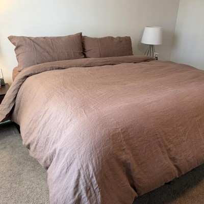 I love this duvet cover!! The color is fantastic, it’s super cozy and comfy and I love how earthy/ boho it feels. The linen is nice, not scratchy at all. It does wrinkle a little bit but after making the bed the wrinkles seem to relax quickly. It definitely runs large! I have my extra giant duvet insert in it and it fits perfectly, if you’re looking for that fluffy cozy vibe you might want to size down on the duvet cover? I like that the buttons for the closure are kind of hidden in the way it’s sewn and I haven’t had any issues with the buttons popping open. The ties to secure the insert seem very sturdy, though I do wish they were a tiny bit longer. 10/10 would recommend.