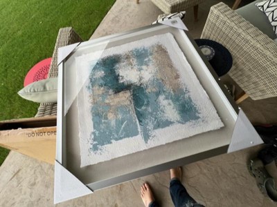 [This review was collected as part of a promotion.] I am extremely happy with this picture (painting). This is a very interesting piece of art. It appears to be a handpainted print matted on canvas inside a glass frame. The colors are vivid and it makes a great impression as soon as one walks into my home. It comes fully framed with 2 d-rings attached. The only negative that I could say is that one of my d-rings was askew and I needed to unscrew it and screw it back in so that it would not be visible when looking at it from the front. The frame is heavy, meaning it does not feel flimsy at all and it comes packed very well. I'd highly recommend this piece. I attached a picture from the front as well as a closeup to help see how the print is housed in the glass. If you're in thr market for a 2 ft x 2 ft piece, I say go out and get it!
