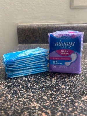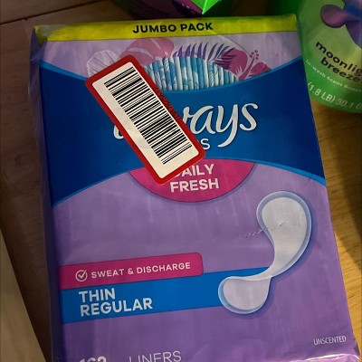 Always thin daily liners have Always kept me smelling fresh and I'm always dry. The packing is so pretty and not embarrassing to carry out of the store when you check out. The way it stays dry and lasts nearly all day is amazing. I dare you to Always stay fresh and dry with the amazing Always thin daily liners.