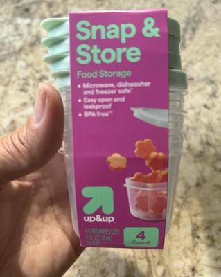 [This review was collected as part of a promotion.] I purchased these snap and store containers from up and up for snacks on the go. They quickly became my favorite as they are small yet just enough for snacks. They are four ounces which is perfect for a small snack. I also use them for salad dressing. I love that you can use them in many ways - microwave, dishwasher, and freezer safe. Another plus is I love the mint color! I received an incentive to write this review.
