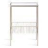 Add the contemporary Trubey side table to your elegant modern home decor. This table combines modern sophistication with pure practicality, featuring a sleek, mirrored glass top and a convenient bottom storage rack. Use it to store your favorite novels, magazines, tablets, and reduce the clutter in your home. It fits perfectly between the living room couches or next to the loveseat with its smaller stature and simple design. However, it's not exclusively made for the living room; use it as a minimalist table in your bedroom or as a place to store mail in your entryway. With its clean, gold look and modern style, the Trubey side table blends seamlessly with any contemporary decor. And with its padded feet, you can move this table around the room without the risk of scuffing your beautiful floors. With its gorgeous minimalistic design and useful functionality, the Trubey side table will be the perfect place to set your morning coffee or store your favorite reading materials.
