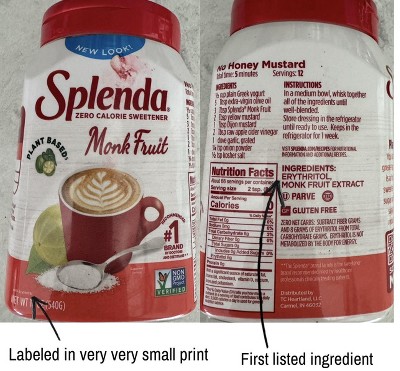 Product is listed and labeled as only Monk Fruit but just happened to see that the first ingredient listed is Erythritol. Once seeing it, I looked all over the label and only then did I notice it is labeled on the front in very very small print at the bottom but the listing description does not include it. And with it being linked to possible heart issue, I look for Monk Fruit only and this is very deceptive and I only happened to notice it being listed as the first ingredient. I didn’t think I’d have to check since at first glance it’s nowhere on the label.
