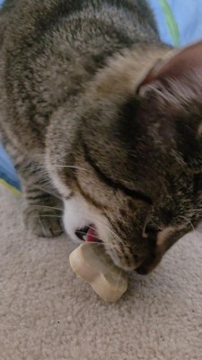 Warning! Choking hazard. Be carful when feeding. My cats love these! I always crumble them up as a topper on their food or break into smaller pieces, BUT one of my cats got a hold of a whole one and it got stuck on the roof of his mouth. He was freaking out. I was able to eventually pry it off the roof of his mouth. It gets very sticky and suctions right up there. Just like the greenies do. Don’t let them eat a whole one. Crumble or break into smaller pieces.