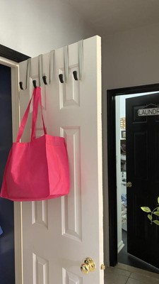 I received this piece as part of the Umbra Ambassador program and I was so relieved when it arrived! My mom stays with us for long intervals and her purse and other items were all over the room (LOL). Thanks to this hanger, her robe, purse, towel and other random things have a place to hang out of the way. I also appreciated that the parts that touch the door are lined in rubber so they won’t scrape or damage the paint! It seems really sturdy too. After I snapped the photo I added a heavier robe and another purse and it still looked nice and sturdy!