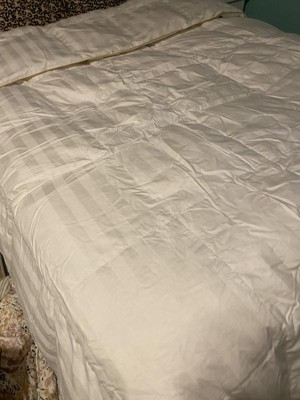 Deliciously, cozy, comforter, warm and perfectly sized. I am used to down comforters having a somewhat crunchy feel but this one is soft and cozy and I feel is all season. It is not too heavy for summer and I don’t think it’s going to be too light this winter either. Very well made, and I’ve had no problems with quills poking through