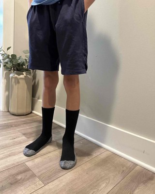 My child wears a size 12 in kids shoes. These crew length socks are meant to fit someone who wears a size 9-2. They fit perfect. This is a six pack that has 3 pairs of white socks and 3 pairs of black socks. All of the socks have a grey toe and heel. The socks reach half way between the ankle and knee. They are nice and thick with extra padding in the toe and heel. I received an incentive to write this review.