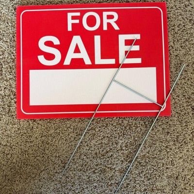 This is the Up and Up branded For Sale Sign. This is a great and sturdy sign. It’s perfect for in your yard or driveway - it has metal stakes that slide easily in between the red thick board. There’s little grooves as my picture shows how it works. This is a great size sign. The words are the same on both sides. The red part of the sign is 12x16. The stakes add a minimum of 11” but could make it sit higher if you done push it in all the way. I do recommend this sign!