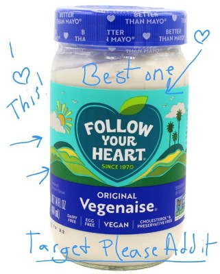 I tried this but unfortunately didn't like it. I was happy to see a vegan shelf stable mayo finally at Target. I will say that taste preferences vary, so maybe try it. If you don't like it, you can return it. Meanwhile, Im wishing for Target to add Follow Your Heart Vegenaise. I love Vegenaise. I'm always suggesting Vegenaise. Doesn't matter if you're vegan, plant based, or not. It's good. These can be a universal mayo for anyone, or if anyone has a food sensitivity/allergy to maybe eggs that is commonly in traditional mayo. Come on Target, bring me my fave Vegenaise to the store plz! Pic of Vegenaise added for visual reference.