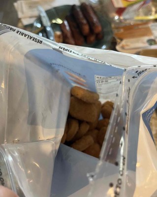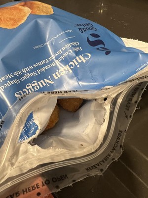 Product resealing was not good. Bag was sealed in the wrong place and therefore ripped under the resealing portion. Note the 'tear here' text was placed under the resealing portion which means if I had cut there, the bag would not be able to reseal at all. Chicken nuggets were good.