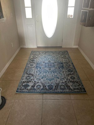 This rug is lovely! The pattern is beautiful and the mix of colors was perfect for our room - which has grayish blue curtains and will soon have a navy loveseat. It is a nice thickness and when we vacuumed it, it did not shed everywhere. Very pleased with the quality for such a low price.