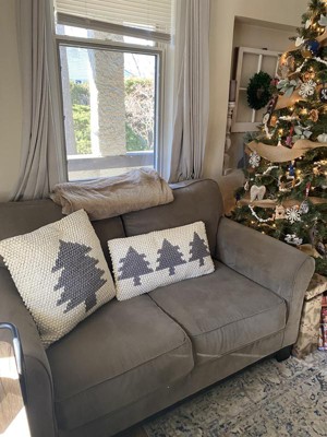 Soft loops. Excellent quality. Simple design. I bought this pillow in gray. It goes great with our couch and neutral Christmas decor!