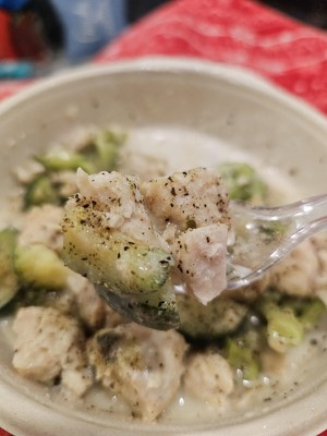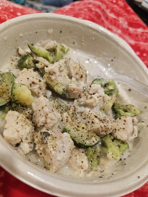 Tasteless and bland! The “sauce” is just water whose second cousin once stood near an Alfredo sauce. Tastes like plain steamed chicken and veggies.