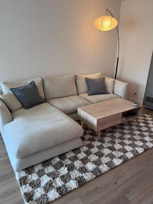 [This review was collected as part of a promotion.] Fun, modern checkerboard rug available in so many sizes. Went 6’ round for a very square nursery. Rug is all poly and very soft, however it did have a strong chemical odor at first. Aired outdoors over our deck chairs for a few days. The length of the shag is substantial, haven’t attempted vacuuming yet. The cream and beige is neutral and very easy to work with. Rugs USA had the best price around!