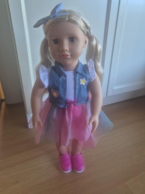 Start the school year in style with Our Generation 18-inch doll Evie! Preppy and classroom-ready, Evie dazzles on her first day in a coordinated outfit that puts a delightful twist on school-day fashion. She wears a denim-style vest with heart and star embroidery, a dress with a rainbow tulle skirt, and bright pink shoes. She also adds a cute hair bow for an extra playful pop! Evie brings her favorite metallic pink school bag packed with fun items like a notebook, pencil, pencil sharpener, water bottle, lunch bag, set of veggies, and 2 sandwich halves. She has a huggable soft body and lifelike features that will delight doll fans during playtime. Her beautiful brown eyes open and close, and her wavy blonde hair is fun to style in many ways. For kids who love dress-up, her outfit has easy-open closures to quickly put on and remove. So you can mix, match, and create more fun looks! Our Generation dolls make a great gift for kids ages 3+ (small parts), encouraging them to imagine their own unique stories.