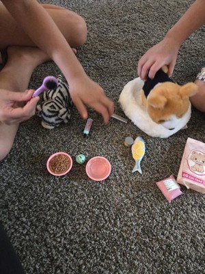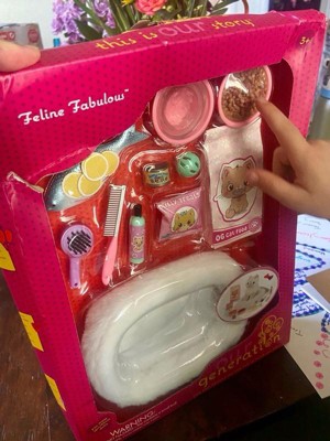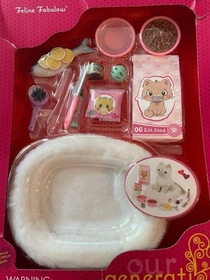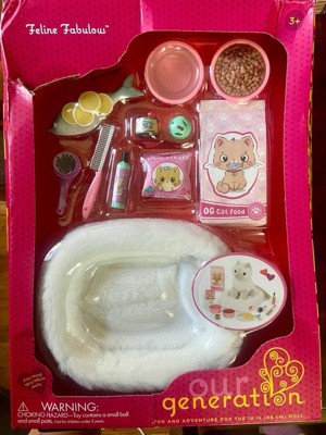 The Our Generation Feline Fabulous set for 18-inch dolls has everything animal fans need to take purrfect care of their favorite kitty! Set up a stylish spot for your best furry friend to dream, eat, and get pampered with the cute pet bed. It's made of soft white plush for extra cozy cat naps. Is today a canned food day or a full fish day? The realistic play food items give kids a variety of options to choose from (especially for finicky kitties!). Plus, themed accessories like the bottle of shampoo, comb, and brush open up lots of grooming and storytelling. Makes a fun addition to pet sets and doll collections. Our Generation doll accessories are a great gift for kids ages 3+ (small parts), encouraging them to imagine their own unique stories. Our Generation dolls and pets sold separately.