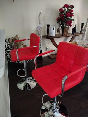 these are super comfy and well padded except arm rests, Love that they swivel and back rest super important! Super bright red which I LOVE!! Easy assembly too! Best of all one stool same brand/style at Rooms2Go is $150, the set at Target $109!!! AWESOME Super happy with this purchase, may get black ones for bar!