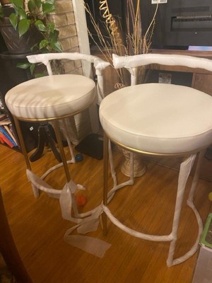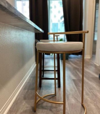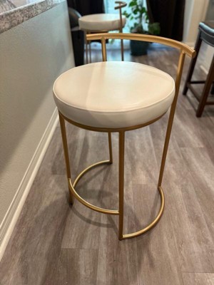 [This review was collected as part of a promotion.] These are gold stools with a white leather seat. They are so sleek and modern . They look so classy and are going to look great at my kitchen island when it’s finished . The seat is a very nice size and they were easy to install just had to screw in the seat