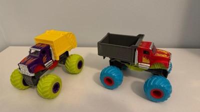 [This review was collected as part of a promotion.] My son has had fun playing with these dump and recycle trucks. They were smaller than I'd expected but that's okay. He likes how the wheels wobble, just like a real monster truck. The dumping feature is really hard to use. My son couldn't do it on his own, and given the cheap quality of these, I don't expect it to last too many times. He has had fun putting different toys in the back parts and driving them around. These are a fun toy, but the quality isn't great.