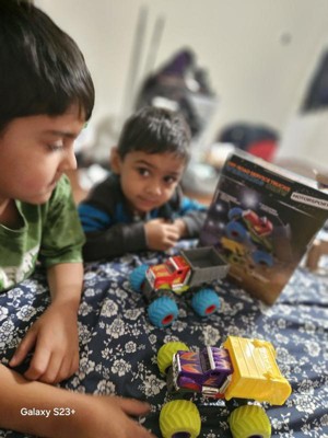 [This review was collected as part of a promotion.] he loved them. His favorite things are monster trucks and construction vehicles, so this was perfect! Dumb truck and garbage trucks with kids love monst6truck and played well and had fun for hours .