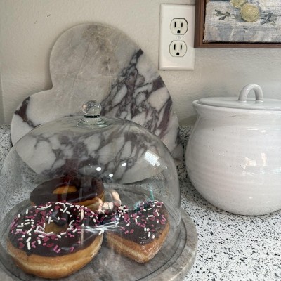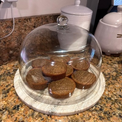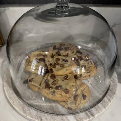 I’ve been eyeing this dessert holder for weeks now. It finally was in stock at a store about an hour away - could not pass it up! The marble itself is beautiful - heavy, of quality. The glass is thick - which I hope it means it won’t easily break. My only compliant is it has a couple of bubbles in it, but no glaring issues. Love it and can’t wait to keep filling it with fresh croissants and cookies!