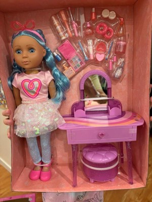 [This review was collected as part of a promotion.] My daughter loves makeup and now she can have a friend to do her makeup with! She loves her new Micah doll. It comes with a vanity and a nice ottoman Micah can sit on and she can store stuff in the ottoman. It’s really nice. My daughter loves her and has already did different hair and makeup looks. The makeup is not really but she has a wild imagination!