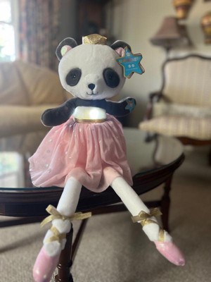 [This review was collected as part of a promotion.] I received the Glow Brights ballerina panda which is absolutely beautiful. It comes with batteries inside It’s soft & has many details like the glittery gold crown and lace up slippers. It plays two songs from the Nutcracker and the cheeks and bodice like up and flash with the music. It sits fairly well on a shelf. Love love love it. Would be pretty for anyone one young or old