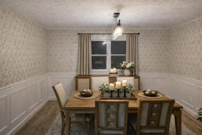 I love this wallpaper . As far as a peel and stick paper this went up with relative ease. The pattern in a soft beige still remains a neutral but adds character to my foyer without overpowering the space. The bit of “pearlish” sheen that is apparent actually reflects the light making the room feel a little more luxurious. I suggest a 40 watt or 60 watt bulb. I used a light amber with a dimmer. It’s just what I wanted.