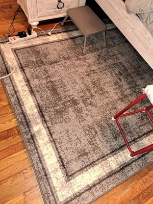 [This review was collected as part of a promotion.] I absolutely love this rug. My living room has lots of grays in it. I love the sort of rustic look. The combination of the colors with the border around the rug, make it stand out. I get compliments every time someone visits. When I first rolled it out, I had to put heavy items on the corners for a day and then it went flat. The picture looks like it has some ripples in it, I can assure you they are not, it’s just the design in the rug. The rug feels nice and soft on your feet. It has some weight to it, so it doesn’t move around when walking on it. It has a rubber type backing.