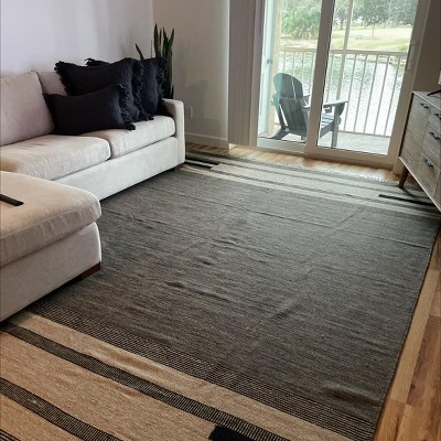 [This review was collected as part of a promotion.] generally we really like the rug. Only issues are that it is thinner than expected and there are a few random pieces of blue plastic that are woven into it. It is more of a charcoal gray than black (which we like)