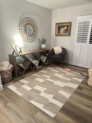 Don't mind the books I'm using to help flatten the rug - but I love this rug! Perfect addition to my den. Can be used in a modern or cozier style home. Colors are neutral and go with so much. Feels nice and soft!
