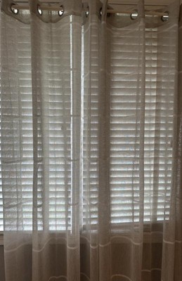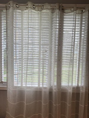 This semi-sheer grommet single curtain panel is a beautiful, slightly delicate, loosely woven faux linen semi-sheer grommet curtain panel with a raised horizontal chenille yarn striped that repeats through the body of the curtain every 8". This lovely, light-filtering fabric adds a casual, flowing, yet elegant texture to any room. This 55" wide curtain panel has an airy feel and compliments any room decor. These panels are available in multiple lengths 63", 84" and 96". Each curtain panel has 8 grommets (1.5" inside diameter). This superior fabric is 100% easy-care polyester. Machine washable and line dry. Imported. Available in three colors: White/White, Grey/White and Natural/White all with silver grommets WOVEN FABRIC: This unique fabric is both casual and elegant, creating a warm natural look and feel in any space. This gorgeous fabric has an open weave that hangs beautifully. GROMMET STYLE: A modern grommet style makes for an elegant, pleated look. This 55" wide panel features 8 metal grommets measuring 1.5" inside diameter. To hang, use a decorative rod to match grommet finish with a diameter of up to 1.25" EASY CARE: This product is machine washable, making it quick and easy to get your curtains back into tip top shape when the time comes. This fabric has been hand chosen for both durability and quality, and you can be confident that it will endure the test of time. For the best look, we recommend that window coverings be steamed or ironed out of the package EXPERT CRAFTMANSHIP: As curtain-makers for 30+ years, we are experts at creating the perfect window covering. No detail is overlooked, and our products are designed to hang beautifully within your home, giving you a very custom look and feel 100% SATISFACTION GUARANTEE: We try to provide the most accurate digital images possible. Color may appear slightly different from one screen to another based on differences in computer monitors, brightness, and other selected settings so there may be variations in color between the actual product and the way it appears online. If you are unhappy with your product for any reason, please contact us and we will correct any issues within 48 hours