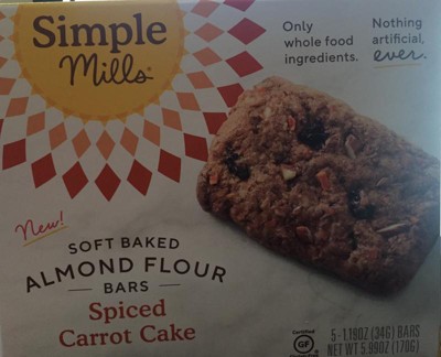 [This review was collected as part of a promotion.] Spiced Carrot Cake Soft-Baked Almond Flour Bars (5 Bars) are great snacks. They include numerous healthy ingredients including a nut and nut flour blend of almonds and organic coconut, a seed blend of sunflower, flax and chia as well as organic raisins, honey and carrots. They really do taste like a spiced cake but mine were a bit lacking in carrots. They are corn and grain free. They are only 160 calories and very filling.