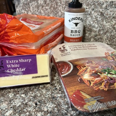 This was super tasty and easy to heat up, with options for 3 minutes in the microwave or about 15 in the warmed air fryer. (The sugar might burn in the saucepan.) We had ours on Hawaiian rolls with coleslaw and white cheddar and a baked potato on the side. Add a little mayonnaise and extra barbecue sauce to the buns and it’s perfect! It was indeed enough to feed three people (breastfeeding mama and two grown men) so factor that in when purchasing.