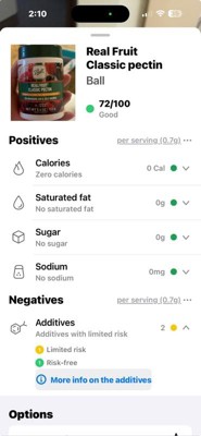 [This review was collected as part of a promotion.] It’s very important to me the ingredients and how a product that my grandkids could possibly be eating at my house scan on the app I use to check for possible ingredients that would not be good for them. This product scanned excellent. The additive was the natural pectin with no harmful ingredients. Me and my DIL make jelly for the grandkids so this was a perfect item for us.