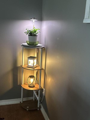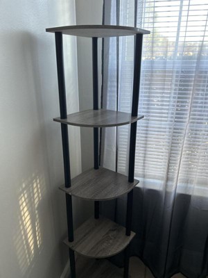 I am so bummed. I was excited to find a corner shelf that fit perfectly in my small space but I will be returning this. Might be my fault for not reading all the description and focusing on look/measurement, but I thought the "legs" would be metal and instead they're plastic. Only one side of the particle board is "painted" so you can clearly see the particle board on the bottom of the top shelf. And then they put the stickers on the front of the wood and they didn't come off. Just feel like the quality doesn't match the price.it is very flimsy.