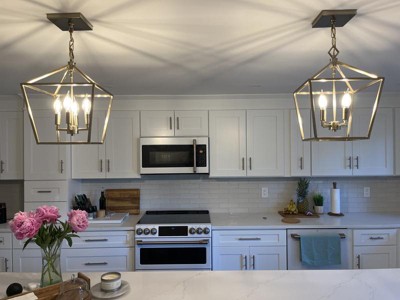 These beautiful lantern lights complete our kitchen. I did my best to match the GE cafe brushed bronze accents and this color works well!