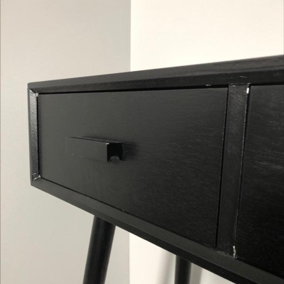 The table is exactly what I needed for this awkward space. The drawers are a nice size for extra storage. Easy to assemble (just screw in the legs). Dark black color is accurate. The drawers are a little difficult to pull out if too much weight is inside, and the legs are a little wobbly, but that may be due to uneven flooring (easily fixed with pads underneath one of the legs).
