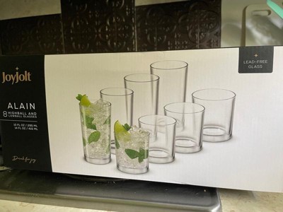 JoyJolt Alain Drinking Glasses Set of 8 Glass Tumblers. Highball 14oz Bar Glasses and Lowball 10oz Rocks Glasses Set