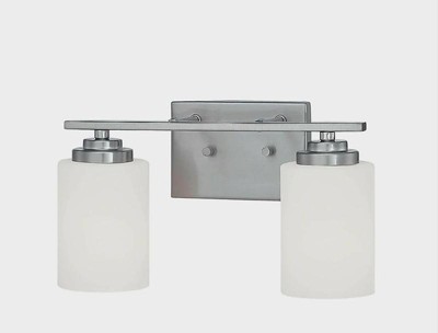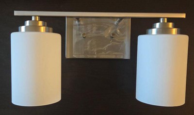 [This review was collected as part of a promotion.] This 2 light vanity light is in satin nickel. It has 2 thick frosted glass shades that give off plenty of light. It's very solid and seems very well built.