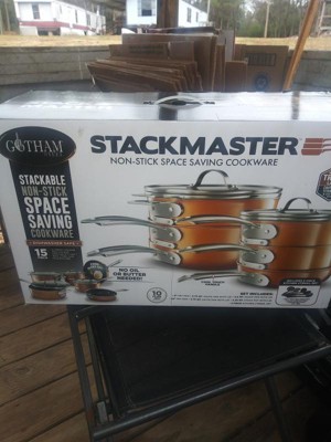 [This review was collected as part of a promotion.] I've been using this set for about two weeks now and I couldn't be happier! I live in a small apartment so space in my kitchen is very minimal. This cookware set has saved me so much trouble trying to find space to keep my pots and pans. Normally i would have to try to stack pots, pans and lids only to have them falling out when I open the cabinet door. With these I know that I can stack them up and they will stay put, I love that! The gold color and sleek modern design of these is just beautiful, they go so nicely with my kitchen decor. Now lets talk about the performance of the cookware. I have cooked lots of things in these so far and nothing has stuck so far. It did take me a little time to get used to the non smooth cooking surface that these have. I was so worried that they would stick really bad since they weren't smooth, but I was pleasantly surprised. They've also been run through the dishwasher several times and are holding up really well. I would definitely recommend giving these a try. So far, they are now my favorite set that I have ever owned.