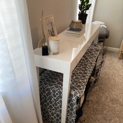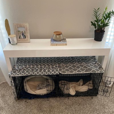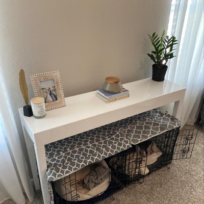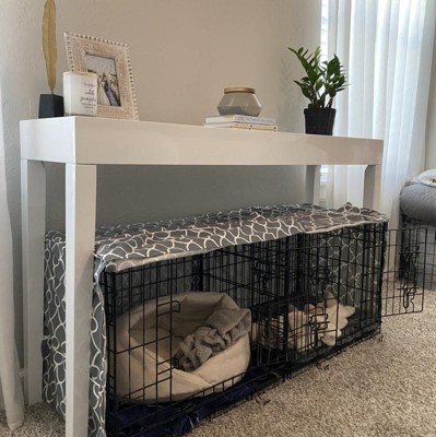 I have been looking FOREVER for a table to place above my dogs kennels in our bend room as a way to draw away from the kennels. This is perfect! It snuggly fits 2 24in kennels underneath it. I’m very happy.