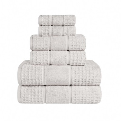 Treat yourself to the ultimate comfort and long-lasting beauty of the Zero Twist Cotton Ribbed Modern Geometric Border Assorted 6 Piece Bathroom Towel Set by Blue Nile Mills. Our zero twist cotton towels are luxuriously soft and plush with a smooth design, ideal for people with sensitive skin. For comfort and durability, the single-ply thickness of each towel provides versatile absorption, perfect for the bath, poolside, or at the beach. Featuring an absorbent ribbed texture with a stylish geometric border, these elegant towels are available in a variety of solid color options to match your bathroom decor style. Pamper yourself while giving a modern flourish to any master bath, powder room, or guest bathroom. This bathroom towel set includes; 2 face towels, 2 hand towels, and 2 bath towels.