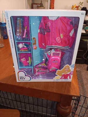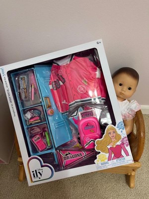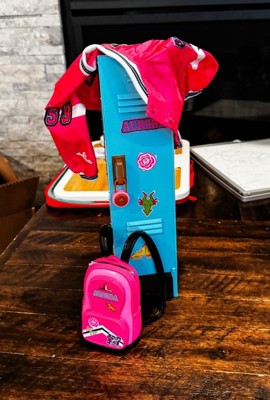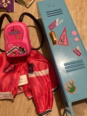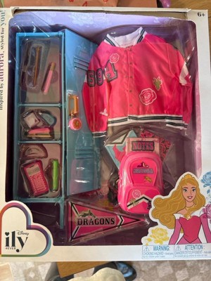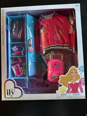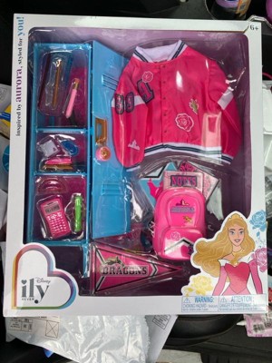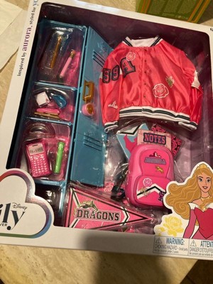 Show your school spirit in style with this Inspired by Aurora Locker Set from Disney ily 4EVER. Your 18” doll will be sure to say “Go Dragons!” when wearing the fashionable pink varsity jacket with “A” for Aurora and rose “patches.” The locker neatly fits all the included notebooks, folders, and assorted school supplies, while the Aurora inspired pink backpack is perfect for taking books on the go. Complete with a combination lock and school pennant, the locker is sure to be the best hangout spot between classes. (Doll not included)