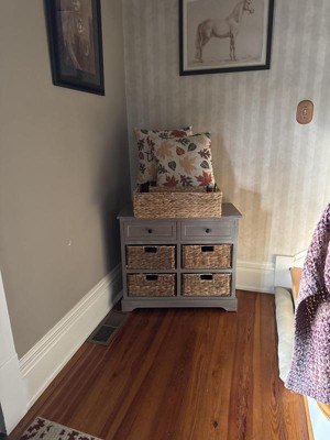 Good quality and great for small spaces. The online pic looks like whitewashed finish, but actual item is a bit darker grey. Great that it came assembled. My only complaint is wicker litter every time you pull baskets out and push back -- 3 or 4 pieces on floor. Maybe over time it will stop doing that, hopefully.