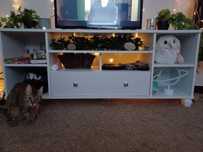 Beautify your living room with a gorgeously functional TV Stand for TVs up to 64". Available in a neutral finish and comprised of engineered wood, this TV stand has seven individual open storage cubbies, including a space for a sound bar. Two shelves are adjustable giving you the freedom to customize your component placement how you see fit. The lower drawer is an excellent storage solution for cords, remotes, or to stow away a blanket to cozy up to on movie nights with loved ones. The TV stand has been rated to fit most flat screen TVs up to 64" or up to 95 lbs. and ships flat to your door in one box. The TV Console requires assembly and two adults are recommended to assemble. Once assembled, the Stand measures to be 57.72" W x 15.67" D x 24.29" H.