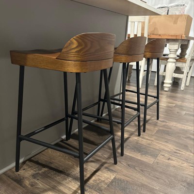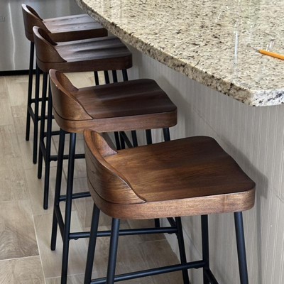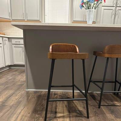 Discover a harmonious blend of functionality and style with our low-back bar stool. It's meticulously crafted from wood that resists cracking, underpinned by a rustproof metal frame fortified with strong metal connectors and anti-slip foot pads to enhance stability and durability. This stool features an ergonomic design for ultimate comfort. The thick 2" padded seat, curved for better body support, coupled with a gentle rounded-edge backrest, promotes a comfortable seating posture conducive to relaxation and ease. For added convenience, this bar stool includes a well-positioned footrest to encourage a relaxed seating position. Elevate your surroundings with this stylish yet functional bar stool.