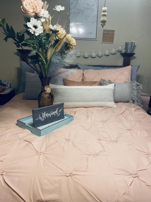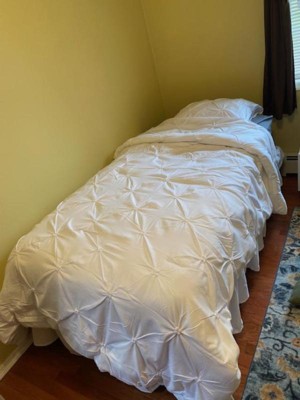 A: The comforter set features a chic pintuck pinch pleat design that adds texture and style.