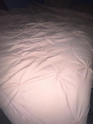 This is such a pretty yet simple comforter. It is a light pink but very muted which allows it to fit into any decor style. The fabic is soft and the comforter feels lightweight but provides good warmth. The pin tuck is accentuated with stitching that make the appearance of a flower. Overall this is a great addition to our guest bed and brings a nice touch of color to the room.
