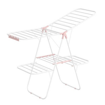 SONGMICS Foldable Clothes Drying Rack with Sock Clips Laundry Drying Rack with Height-Adjustable Gullwings White and Pink
