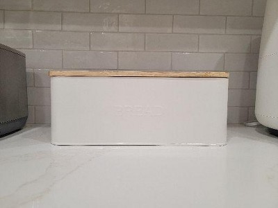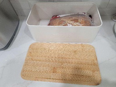 Does the job and looks great on my counter. Hated all the bread products being stored on counter. This works perfectly in a stylish way. The cutting board is a huge bonus as well.
